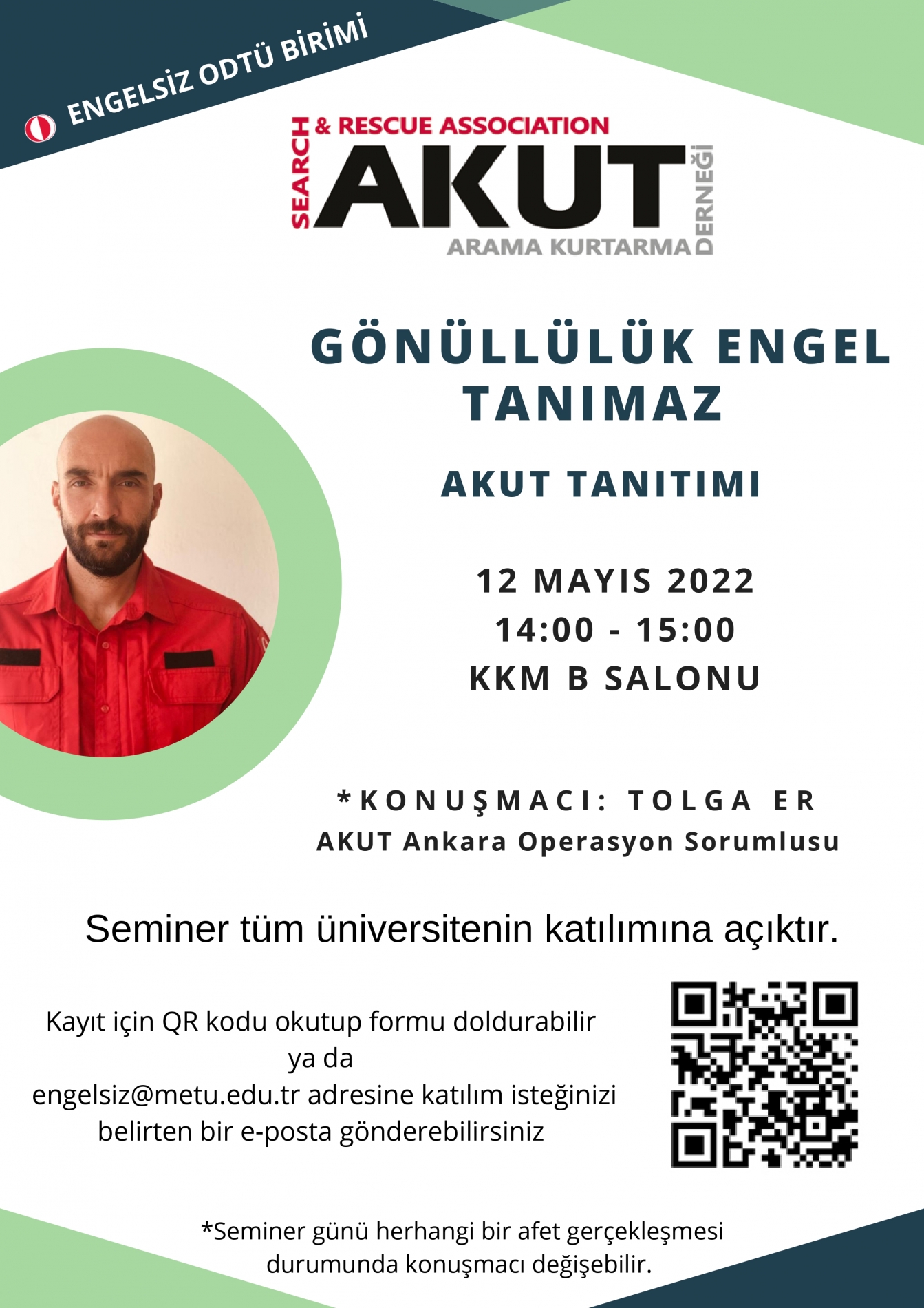 12 Mayıs 2022 Perşembe, 14:00-15:00 saatleri arasında KKM B Salonu'nda birimimiz aracılığıyla "Gönüllülük Engel Tanımaz" başlıklı AKUT Tanıtım etkinliği gerçekleştirilecektir. Etkinlikte AKUT Ankara Operasyon Sorumlusu Tolga Er konuşmacı olarak yer alacak olup etkinlik tüm mensuplarımızın katılımına açık olacaktır. Etkinliğe katılmak için birimimize telefon ya da e-posta aracılığıyla ulaşarak, aşağıdaki bağlantıda yer alan formu doldurarak kayıt olabilirsiniz.
